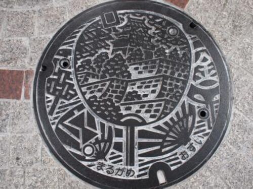 有名な丸亀団扇のデザインです。 (画像を前のブログから保存したので小さめです) カラーリングカバーは丸亀城の近くで撮りました。 こんな金ぴかの蓋も見つけました。 旧丸亀市の市章「立鼓」が中心にある古いマンホールの蓋です。