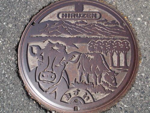旧八束村のマンホールの蓋です。 ジャージー牛がデザインされています。 親子蓋です。 普通の親子蓋よりもずっと大きい蓋もありました。